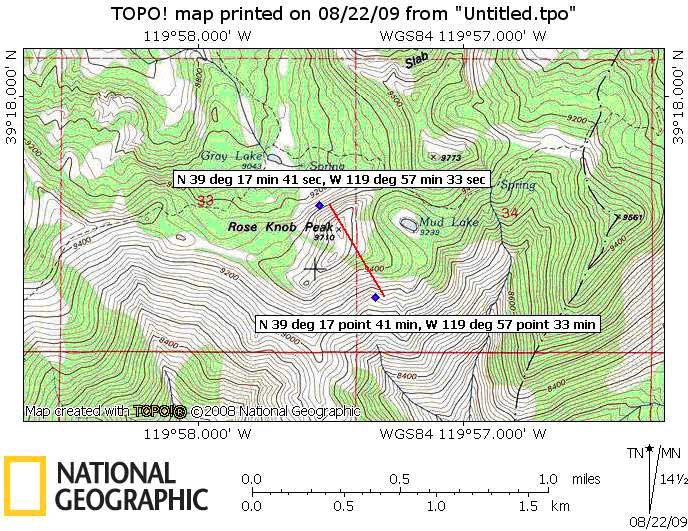 | We frequently have problems accurately communicating coordinates during searches. This is often due to people not understanding how to read a lat/lon coordinate from their GPS. It’s also caused by Federal and State operators who relay cell phone data or ELT data not knowing what the numbers and symbols they are giving to you mean. For example: Where is (39 point 33 point 03, 119 point 49 point 21) ? Or how about (39 point 33 point 052 by 119 point 49 point 355) ? The correct answer is “Nowhere, because these are nonsense interpretations of a lat/lon readout from a GPS”. There is no system which has that many “points” in it. If you get a location which has more than one “point” in each part of the location, then you know that the sender has made a mistake. There are three common formats for lat/lon locations: degrees/decimal degrees; degrees/minutes/decimal minutes; and degrees/minutes/seconds or degrees/minutes/seconds/decimal seconds. Recognizing and reading these three formats is explained below. Remember that in lat/lon, the world is divided into 90 degrees of latitude running “up” the globe from the equator to the North Pole, and 90 degrees running “down” the globe to the South Pole. We also have 360 degrees of longitude which connect from pole to pole. Each degree is split into 60 minutes, and each minute is split into 60 seconds. Right there we get another red flag: if somebody reads a coordinate with more than 60 minutes or more than 60 seconds, we know that they are confused. Degrees are noted with the symbol o . So 39 degrees is shown as 39o. Minutes are noted with an apostrophe or feet symbol ‘ . So 39 minutes shows as 39’. Seconds are noted with a quote sign or inch symbol “ . So 39 seconds shows as 39”. We always want to be as precise as possible, and the GPS and computers we use give us details down to very fine resolution so there will almost always be a decimal thrown in somewhere, depending on how new or fancy your GPS is. To properly read the decimals as they would be used in the common lat/lon formats, let’s look at the intersection of North Virginia Street and North McCarran Blvd. In these examples I’ll be using WGS84/NAD83 instead of our preferred NAD27, because most of the info we get in lat/lon will be coming from or going to a unit/agency that uses WGS84 as their datum. Also note that some GPS put the N and W in front of the coordinate instead of behind it. In degrees/decimal degrees, this will show as 39.55087o N, 119.82259o W . This is read as (39 point 55087 degrees north, 119 point 82259 degrees west). Note that there is only one “point” in each half. In degrees/minutes/decimal minutes, this will show as 39o33.052’ N, 119o49.355’ W. This is read as (39 degrees 33 point 052 minutes north, 119 degrees 49 point 355 minutes west). Note once again that there is only one “point” in each half. Your clue that this is minutes/decimal minutes instead of minutes and seconds is that there is no “ sign anywhere that would denote seconds. Pay close attention to these small details. In degrees/minutes/seconds, this would show as 39o33’03” N, 119o49’21” W . This is read as (39 degrees 33 minutes 03 seconds north, 119 degrees 49 minutes 21 seconds west). An older GPS and some mapping programs are set up to show seconds as the finest resolution available. Newer GPS like my Garmin 60csx will show decimal seconds as well. You might see this same location as 39o33’03.3” N, 119o 49’22.3” W . This is read as (39 degrees 33 minutes 03 point 3 seconds north, 119 degrees 49 minutes 22 point 3 seconds west). Why does this matter? Let’s look at an example. Suppose you have a GPS and your display says (N 39o17’41”, W 119o57’33”). This reads as (north 39 degrees 17 minutes 41 seconds, west 119 degrees 57 minutes 33 seconds). It places you on the steep slope on the North side of Rose Knob Peak as shown below. But being sleepy, or inexperienced, or careless, or not having practiced, you read this as (39 point 17 point 41, 119 point 57 point 33, or maybe the ever popular (thirty-nine, seventeen, forty-one by one hundred nineteen, fifty-seven, thirty-three)). This is a plausible location for both degrees/minutes/seconds and degrees/minutes/decimal minutes, even though there are too many “points” given and the command post should immediately recognize this and ask you for a corrected location. But if comms are poor, or the other team trying to find you in the sleet is inexperienced or doesn’t know their nav any better than you do, they could easily enter this as degrees/minutes/decimal minutes and end up 600 yards away on the wrong side of the ridge (as shown on the map below)!