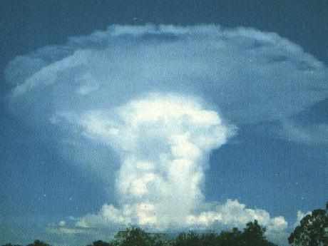 Cumulonimbus clouds rise vertically and expand dramatically from their original white, puffy bases to soar high into the upper atmosphere. On other occasions their tops will flatten out into a menacing, anvil-like shape. These classic "thunderhead" clouds foretell potentially severe weather. Cumulonimbus clouds also form independent of cold fronts, blossoming in the afternoon hours of very warm days and producing late-afternoon thunderstorms.